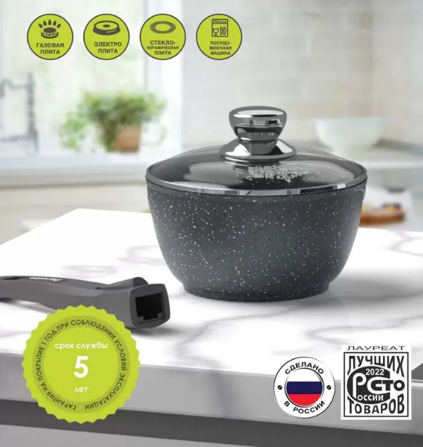 Ковш Мечта 1.7 л Гранит с антипригарным покрытием со съемной ручкой и крышкой, индукционная