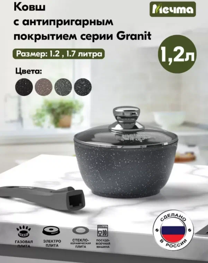 Ковш Мечта 1.2 л Гранит с антипригарным покрытием со съемной ручкой и крышкой, НЕ индукционная