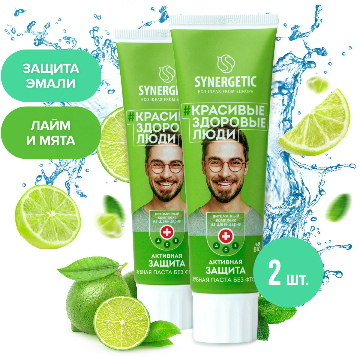 Купить Зубная паста SYNERGETIC Активная защита "лайм+мята", натуральная, без фтора 100 гр, 2 шт.