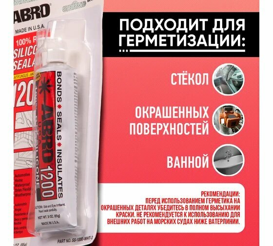 Ниже Вы можете прочитать отзывы на Силиконовый герметик ABRO SS-1200-WHT-3, ознакомится с подробными характеристиками, посмотреть интересные обзоры и фотографии на Силиконовый герметик ABRO SS-1200-WHT-3.