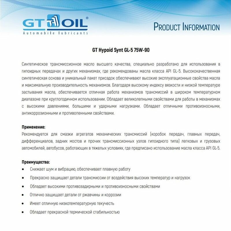 Масло Трансмиссионное Синтетическое Всесезонное Gt Hypoid Synt, Sae 75W-90, Api Gl-5, 1 Л GT OIL арт. 8809059407868
