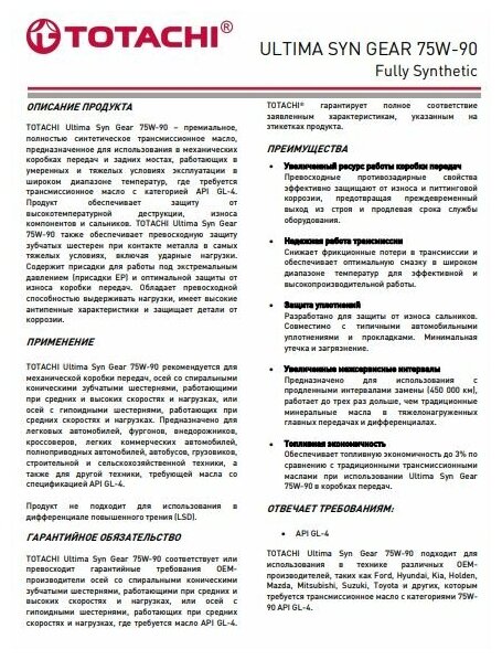 Totachi Масло трансмиссионное Ultima Syn-Gear 75W-90 GL-4 1л 4589904931543 .