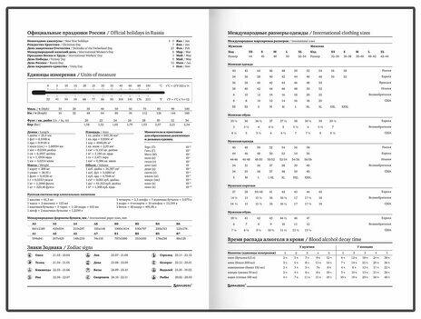 | Плюсы: | Отличный стандартный ежедневник. Есть много полезной справочной информации от единиц измерения до времени распада алкоголя в крови)) Можно начинать с любого дня, проставить числа не сложно. Я беру по 2 листа на день. |