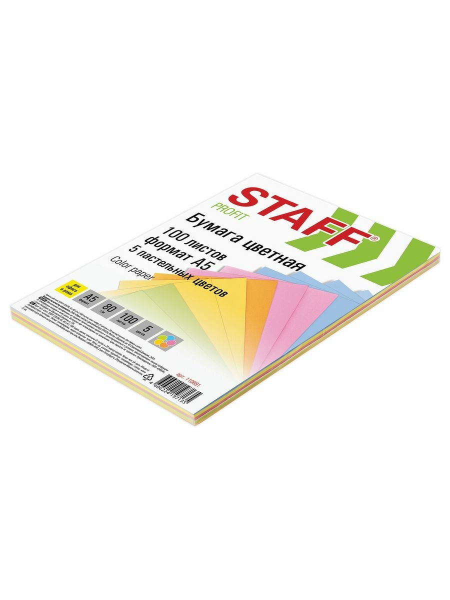 Бумага цветная Staff "Profit" А5, 80 г/м2, 100 листов, 5 цветов, цветная пастель, для офиса и дома