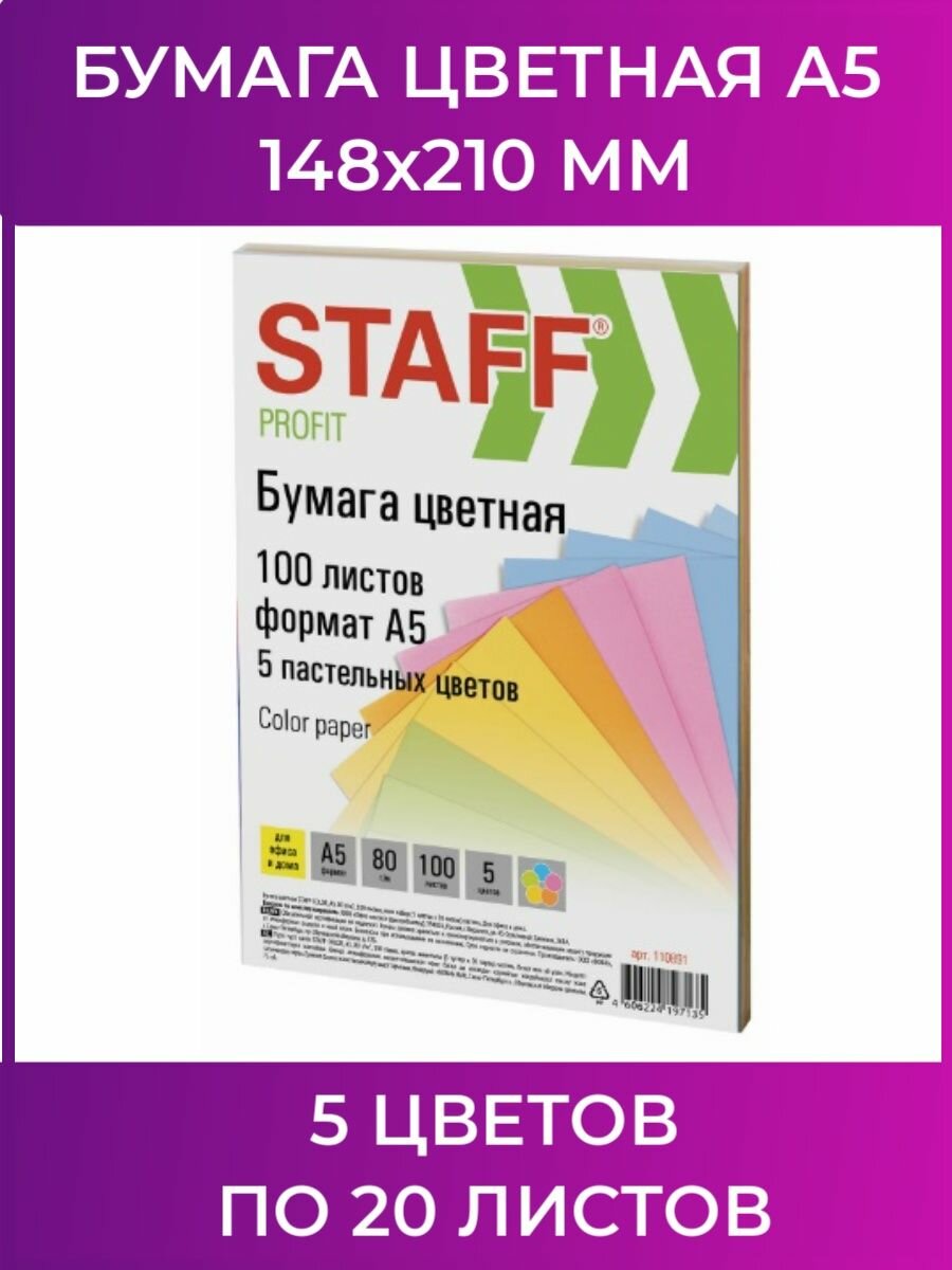 Бумага цветная STAFF "Profit" малого формата (148х210 мм), А5, 80 г/м2, 100 л. (5цв. х 20 л.), цветная пастель, для офиса и дома, 110891, 110891