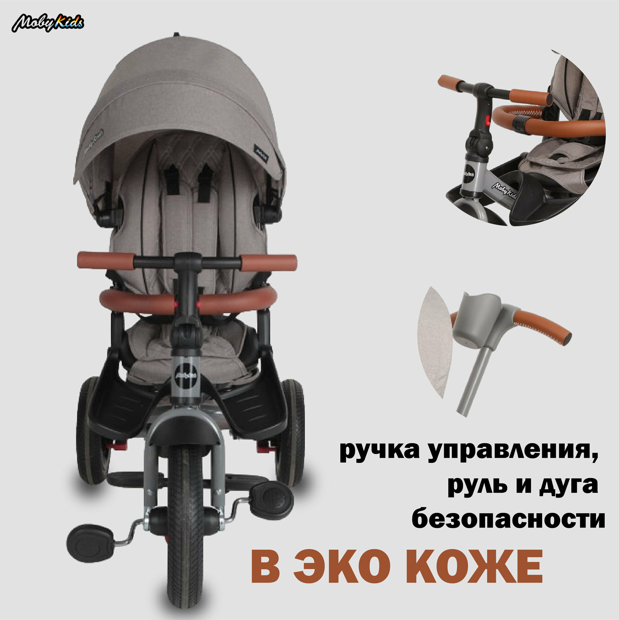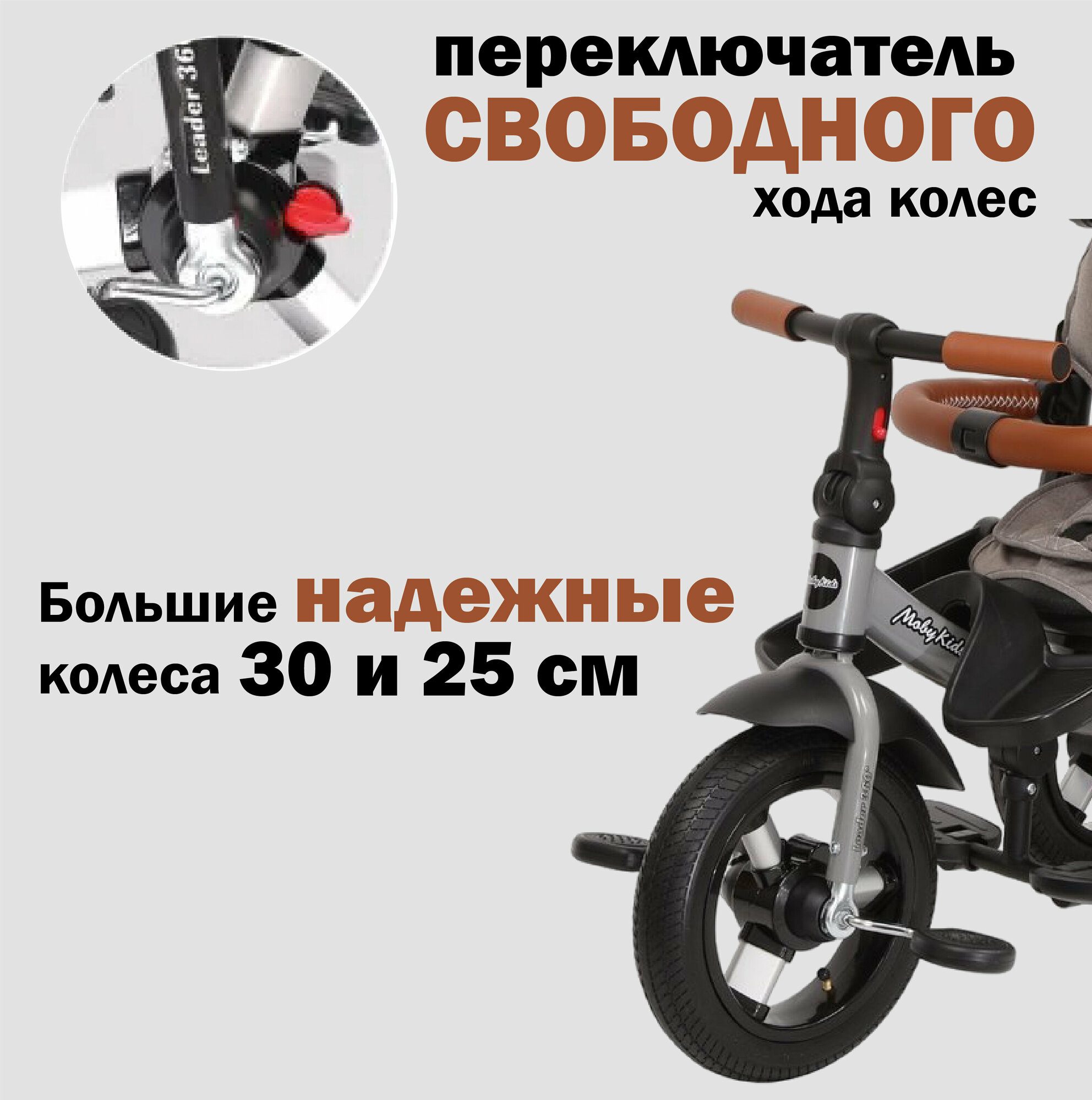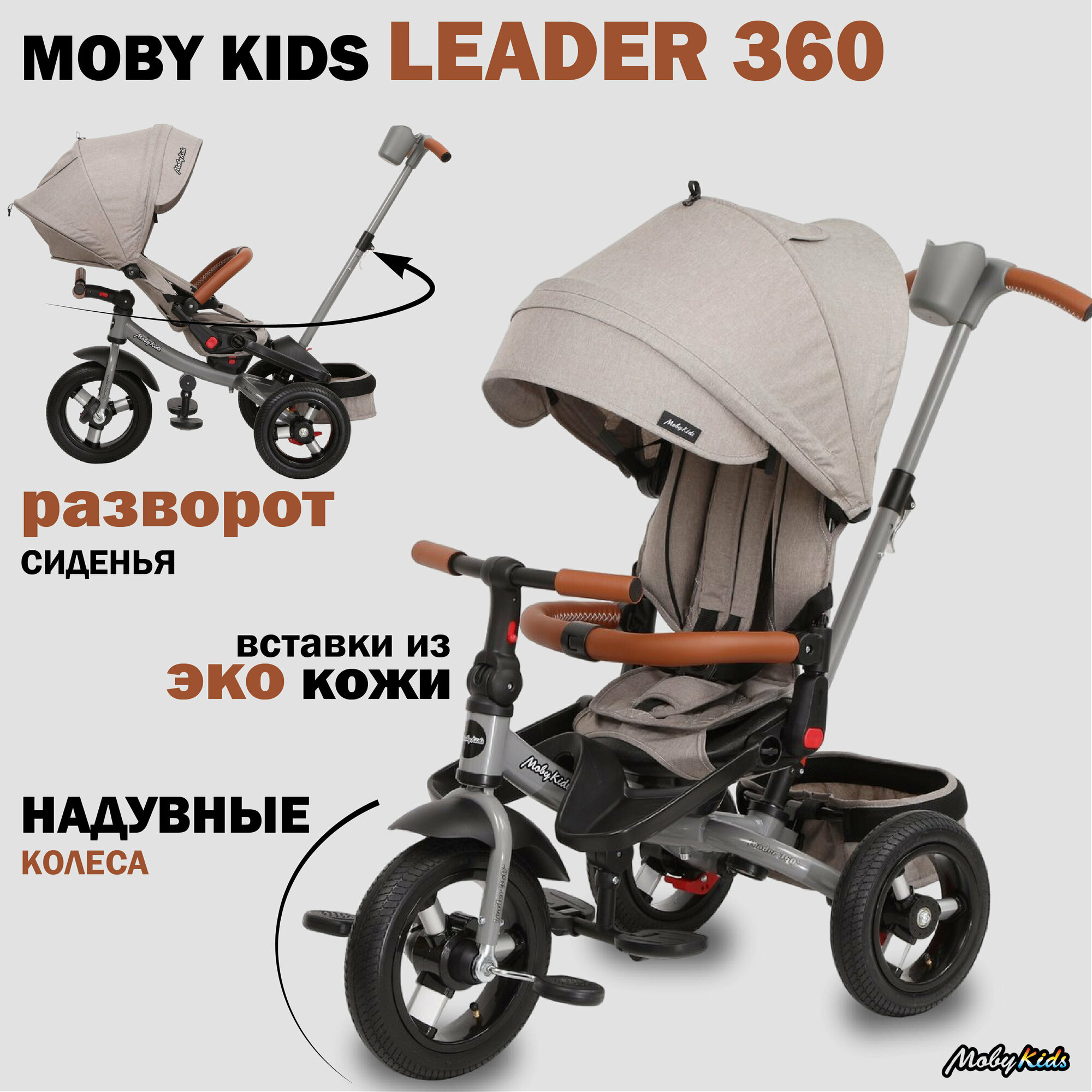 Велосипед трехколесный Moby Kids Leader 360, колеса 12 и 10 дюймов, AIR, черный, экокожа (63127)
