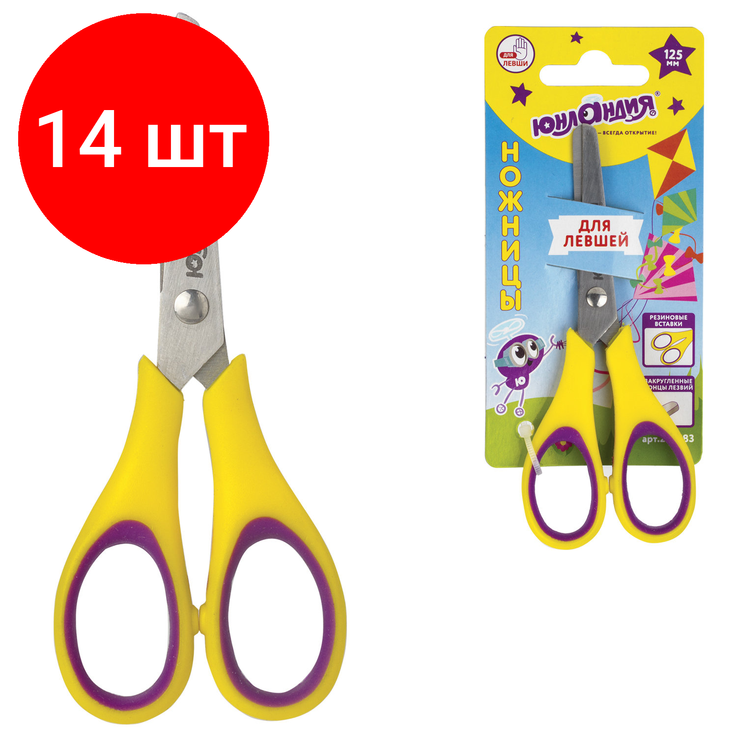 Купить Комплект 14 шт, Ножницы юнландия "воздушный змей", 125 мм, для левши, резиновые вставки, желто-фиолетовые, европодвес, 236783