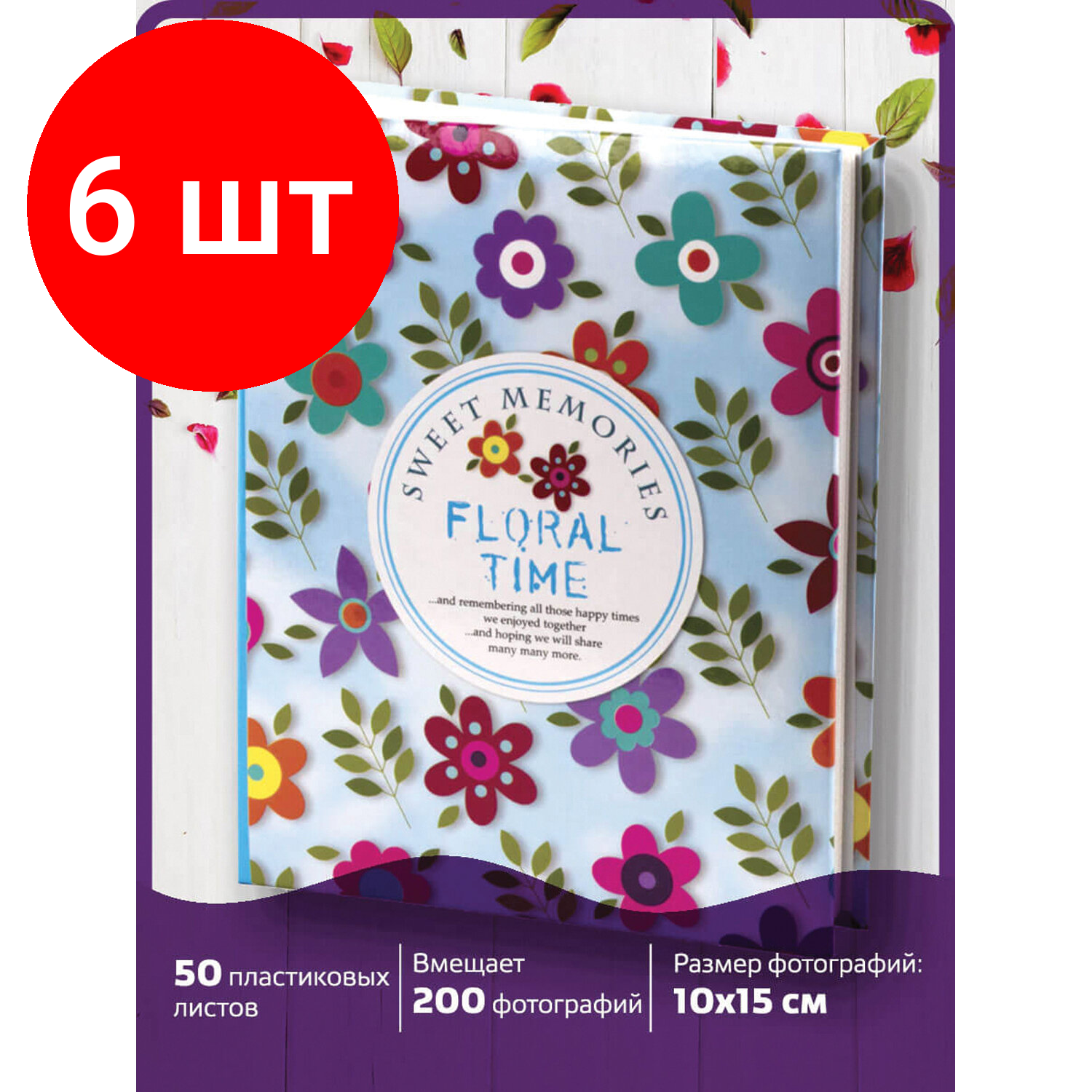 Купить Комплект 6 шт, Фотоальбом BRAUBERG на 200 фото 10х15 см, твердая обложка, "Цветочки", разноцветный, 391119