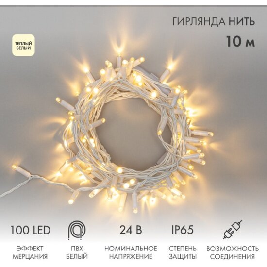 Гирлянда светодиодная Нить 10м 100 LED теплый белый белый ПВХ IP65 эффект мерцания 24В соединяется NEON-NIGHT нужен трансформатор 531-100/531-200 1 шт арт. 305-236