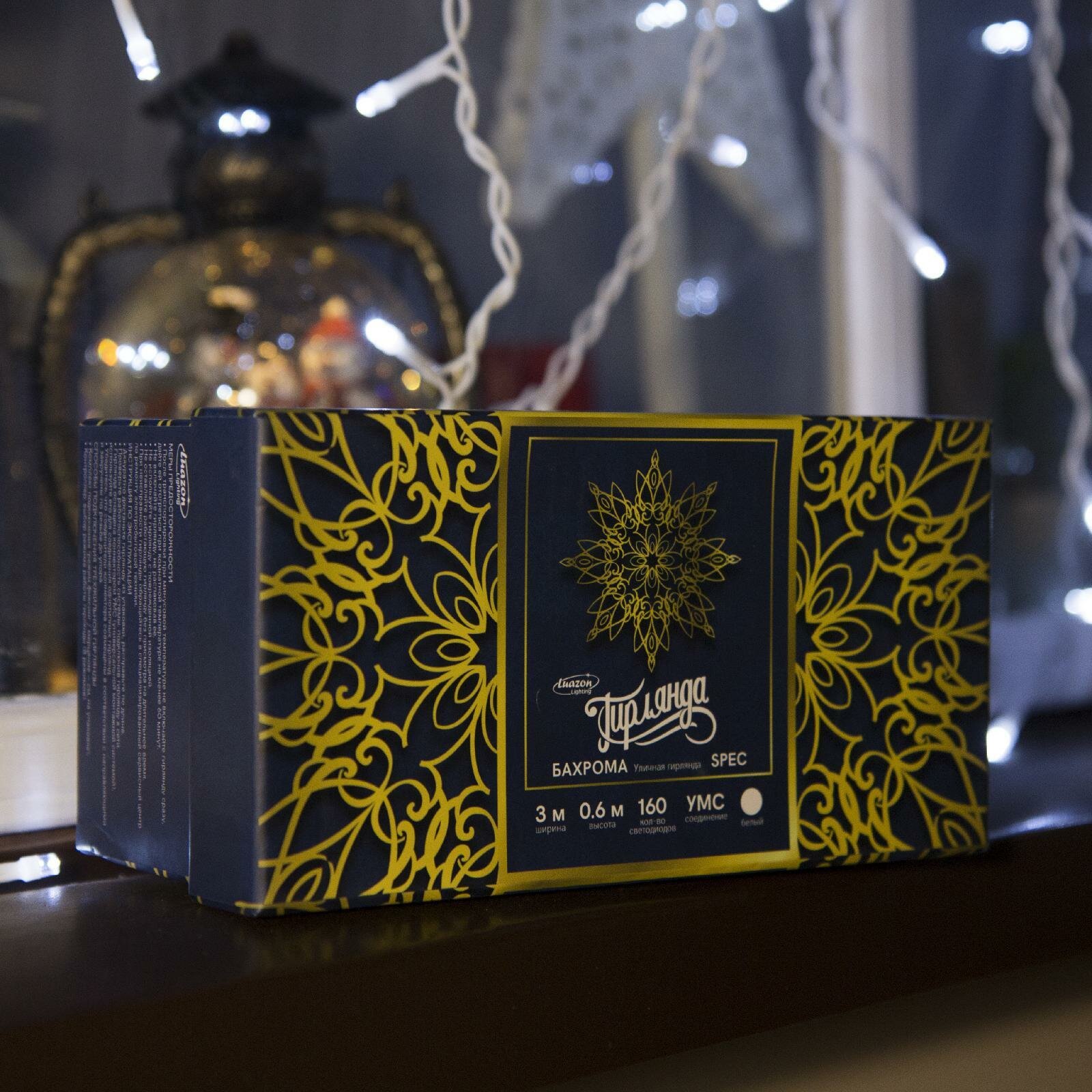 Гирлянда уличная новогодняя, Бахрома, 3 х 0.6 м, IP44, УМС, белая нить, 160 SMD-LED, свечение белое, 220 В