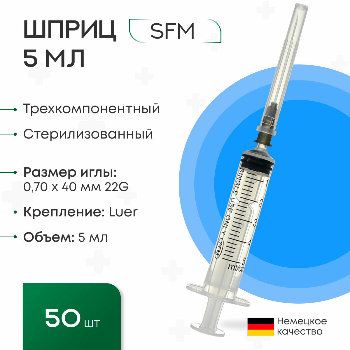 Шприц медицинский 5мл комплект 50 шт. SFM Luer (3-х компонентный), с иглой 0,7 x 40 - 22G