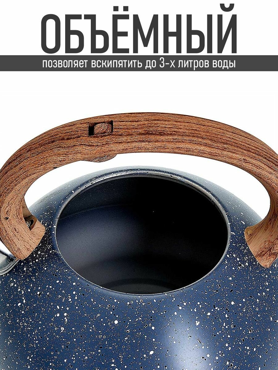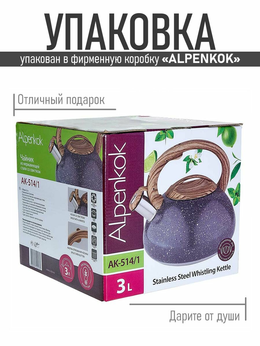 Чайник нержавеющий со свистком 3.0л Alpenkok AK-514/1 серый гранит, ручка soft touch, для всех плит