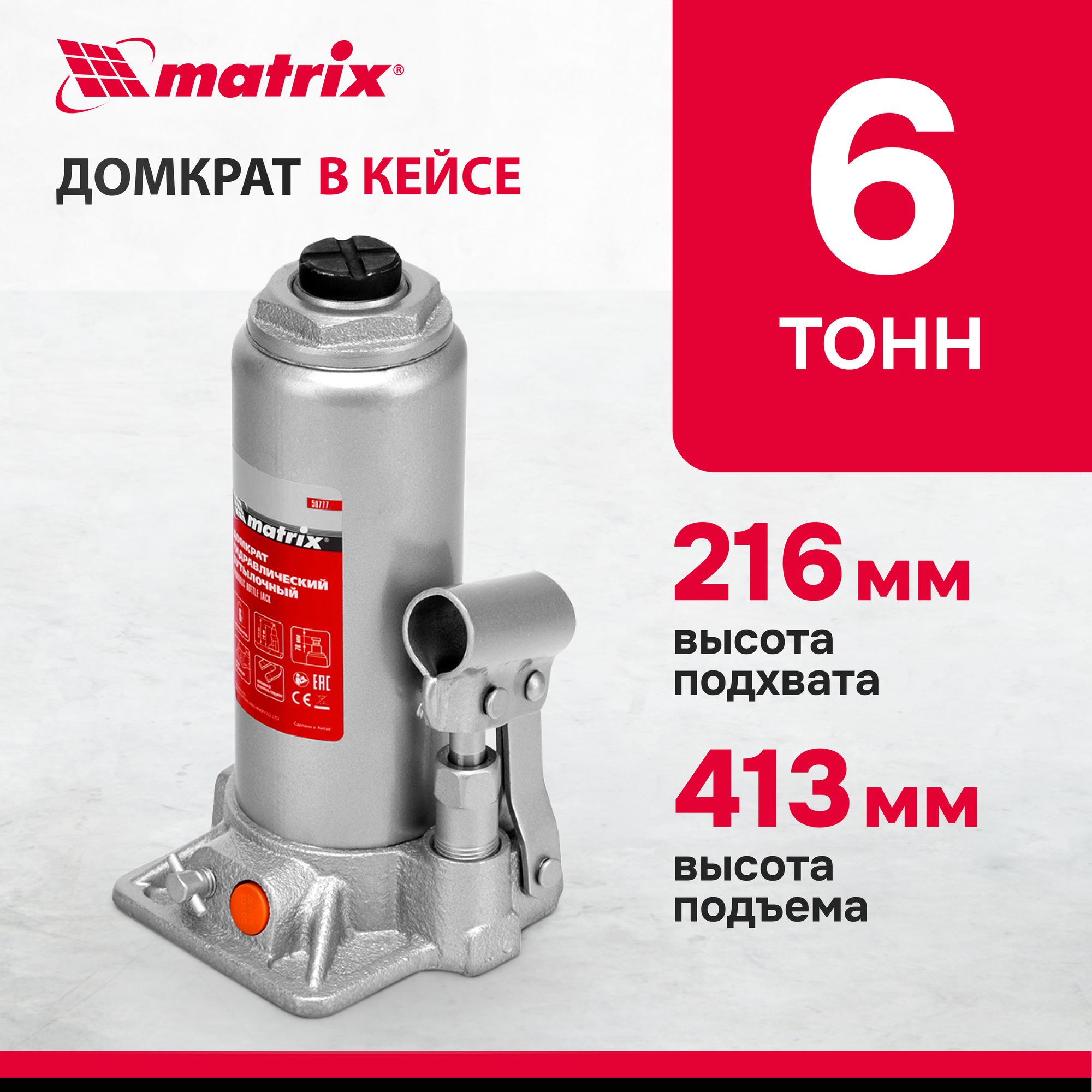 Домкрат гидравлический бутылочный, 6 т, h подъема 216-413 мм, в пластиковом кейсе Matrix ( 50777 )