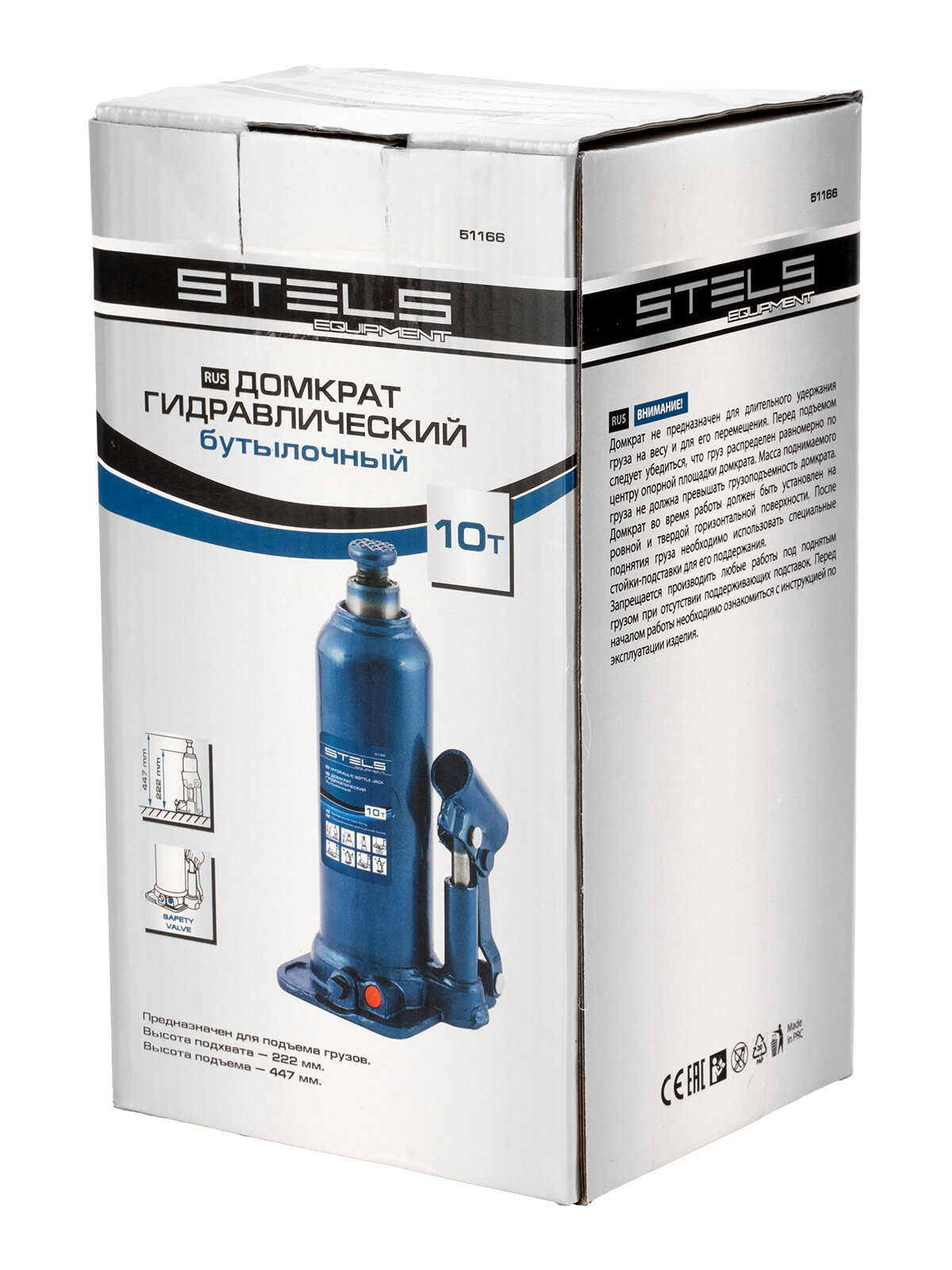 Домкрат гидравлический Stels 51166, бутылочный, 10 т, h подъема 222-447 мм Stels 6786939 .