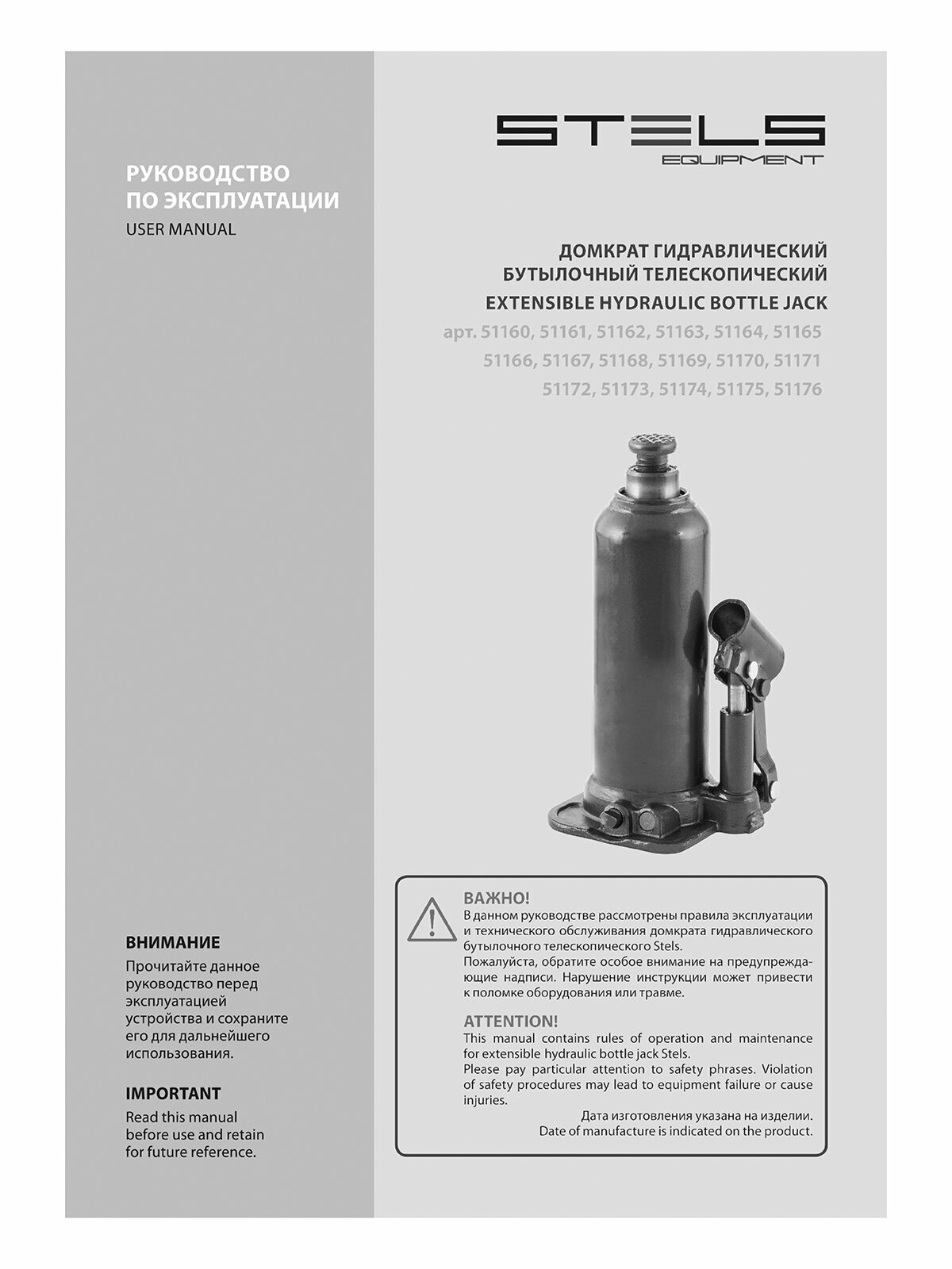 Домкрат гидравлический бутылочный STELS EQUIPMENT STELS 51167, 12 т, h подъема 227–457 мм