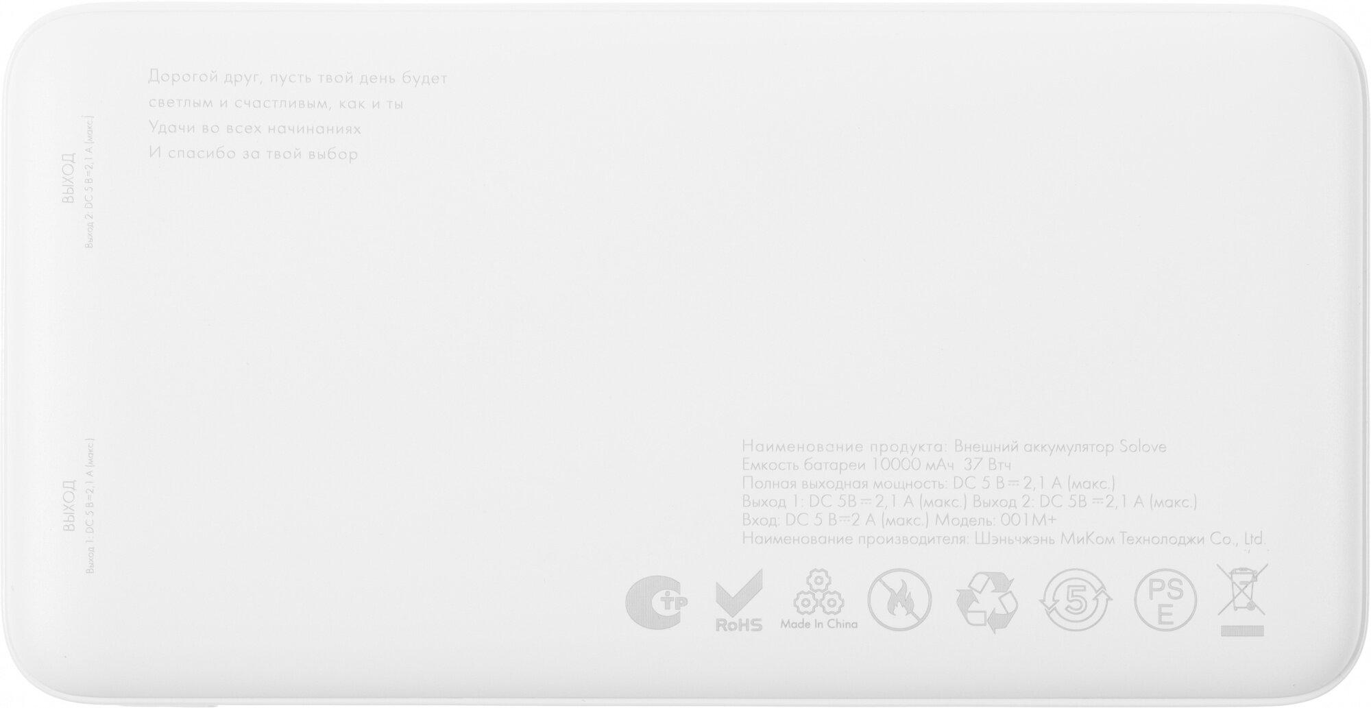 На пауэрбанке на ломаном английском написаны комплимент и пожелание хорошего дня, смотрится странно, в лучших традициях контрафактных китайских товаров в 90-х. |
