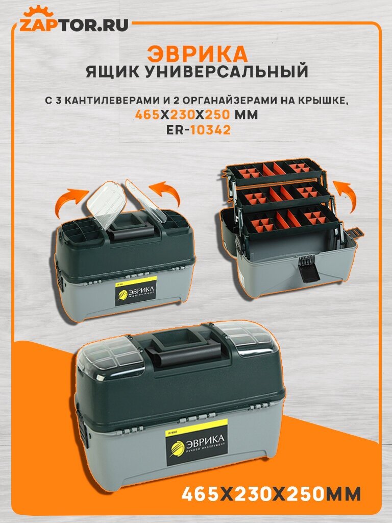 Универсальный ящик эврика с 3 кантилеверами и 2 органайзерами на крышке, 465х230х250 мм ER-10342