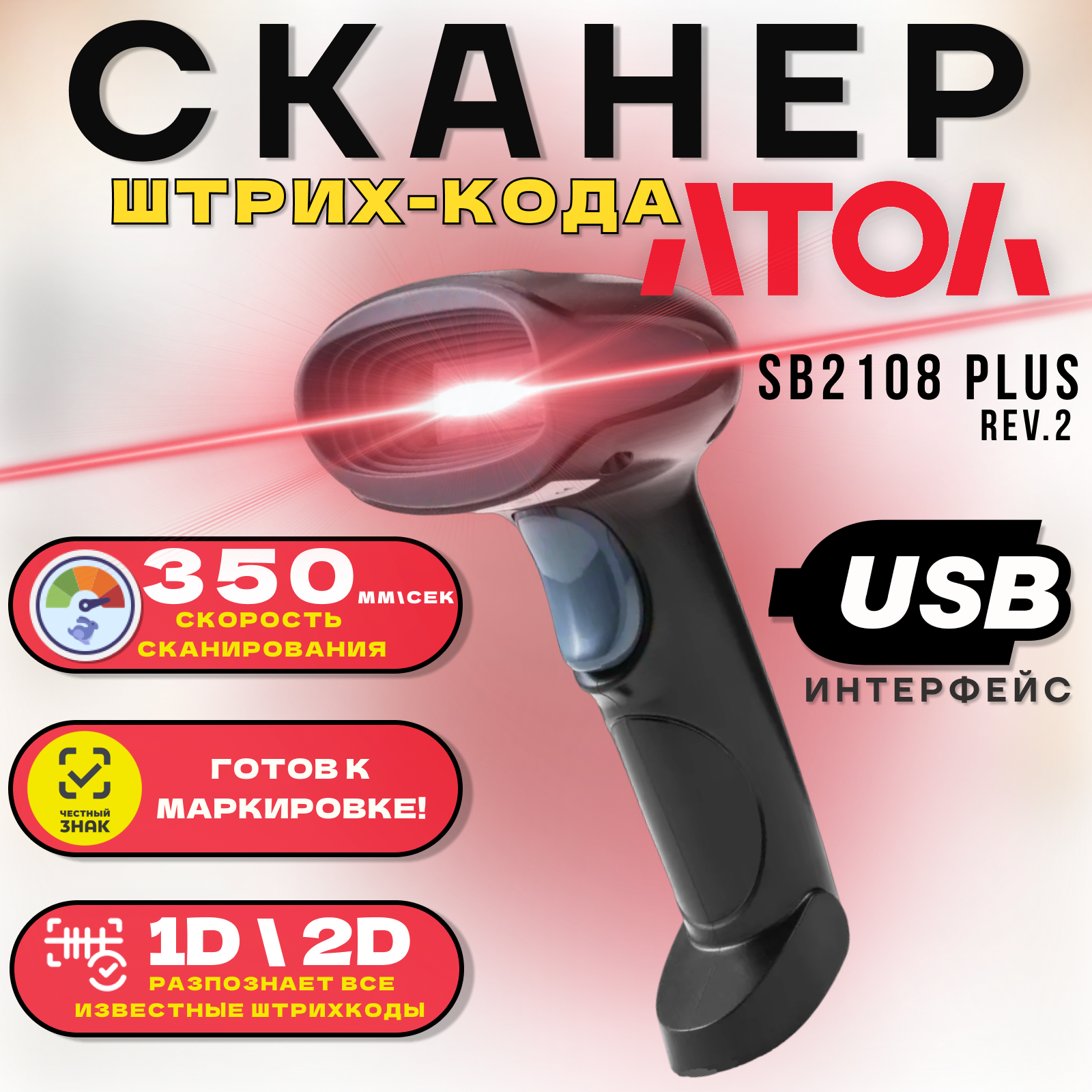 Сканер штрих кода АТОЛ SB2108 Plus проводной / ручной сканер / USB, 1D, 2D код/ 2D сканер штрихкода / сканер для кассы / сканер для магазина / сканер для маркировки / сканер QR- кода / для ЕГАИС, Честный знак, АТОЛ, Мой Склад, эвотор, Меркурий, МТС-касса,