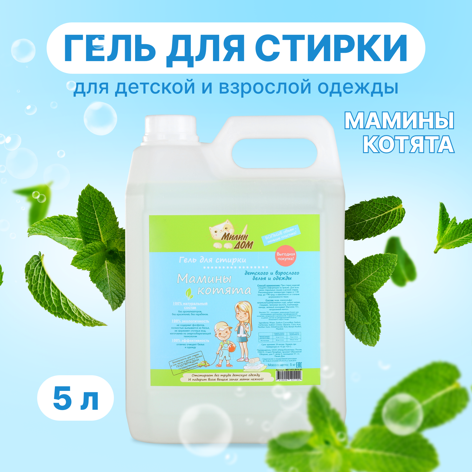 Милин Дом Гель для стирки взрослой и детской одежды "Мамины котята" с ароматом мяты, 5 л