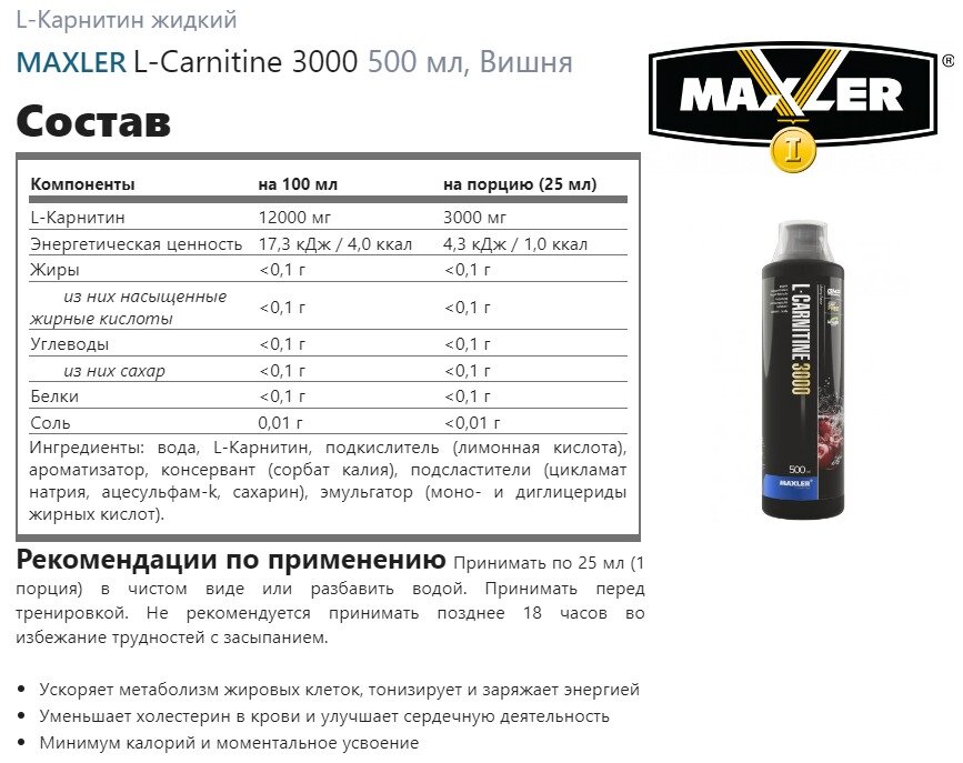 Ниже Вы можете прочитать отзывы на Л-Карнитин Maxler L-Carnitine 3000 - Вишня, 500мл - Концентрированная жидкая формула - 3000 мг в порции, ознакомится с подробными характеристиками, посмотреть интересные обзоры и фотографии на Л-Карнитин Maxler L-Carnitine 3000 - Вишня, 500мл - Концентрированная жидкая формула - 3000 мг в порции.