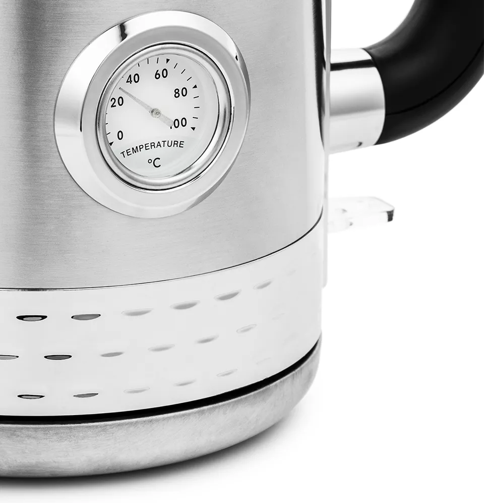 Искали специально с термометром для чайных церемоний. Термометр удобно расположен и работает исправно - всем довольны! Даже кнопка включения нажимается как-то по особенному приятно и очень легко)) Чтобы всегда оставался блестящим капельки воды, которые попадают на поверхность, лучше сразу протирать полотенцем - это совсем несложно)) На кухне он просто красавчик! Рекомендуем! |