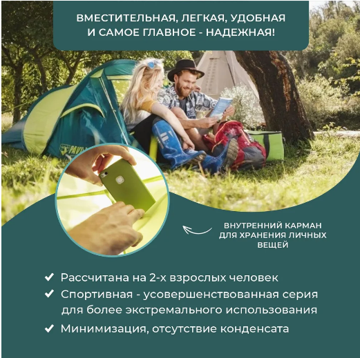 Палатка абсолютно не дышит. Спать в ней невыносимо душно даже при распахнутом входе, не говоря про закрытую. Не укрывает от дождя. Даже маленький дождик промочит Вас. Проверено Очень мало места. При моем росте в 185 ноги разогнуть не смог. Вдвоём спать тесно. Ну и вишенкой на торте была комплектность. Отсутствовала 1 из 4 веревок для натяжки палатки. Считаю, что данная палатка не подходит для ночлега, да и людей в целом. Хранить в ней можно только вещи |