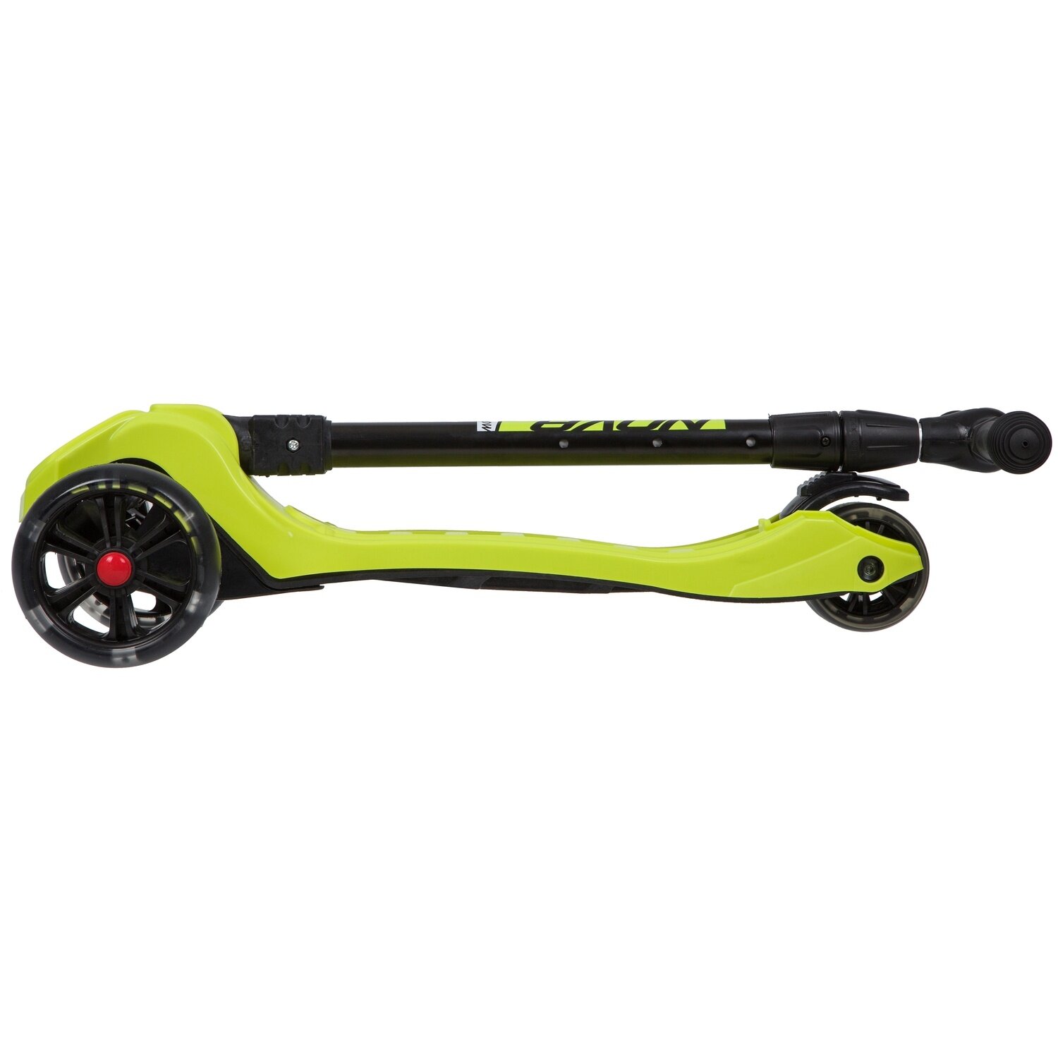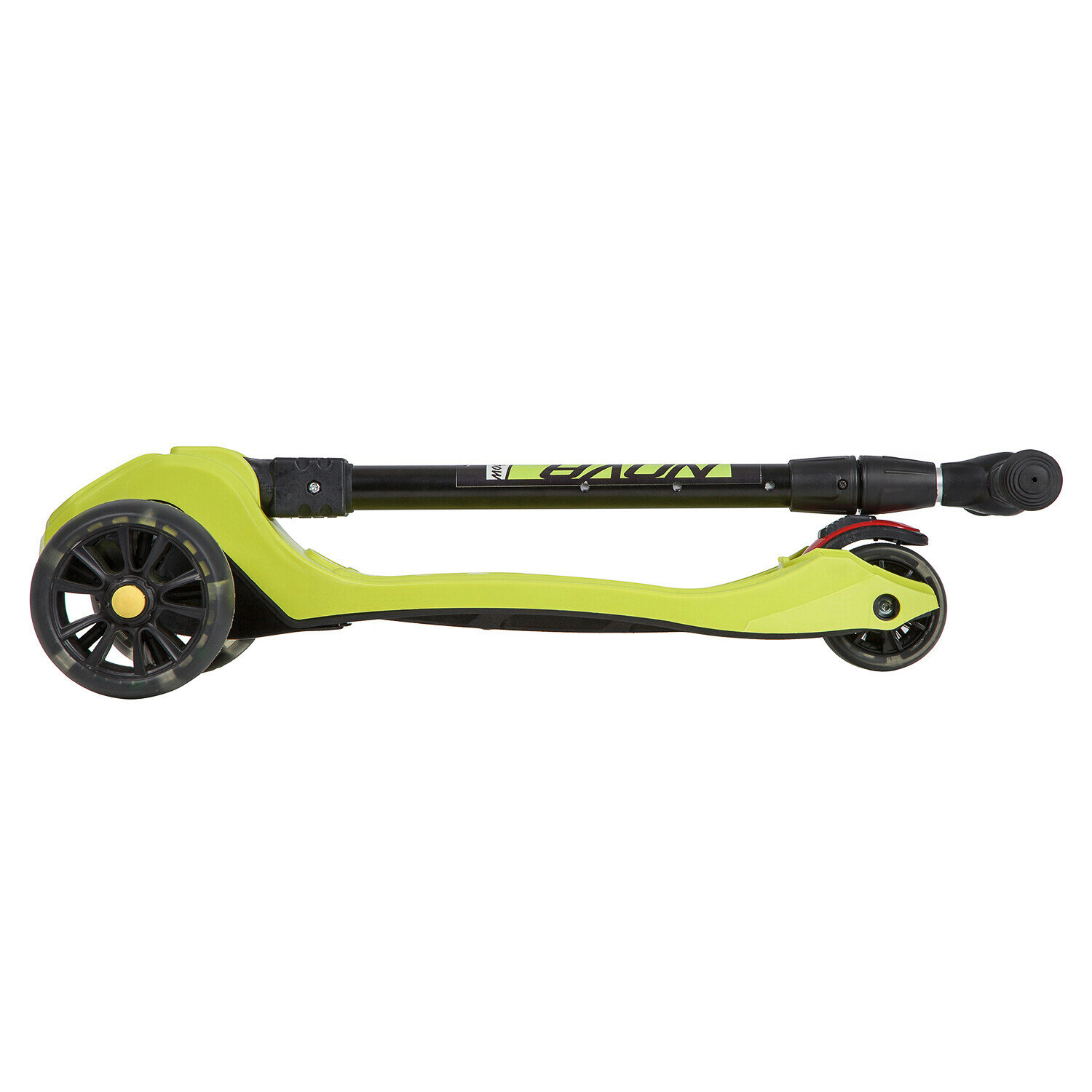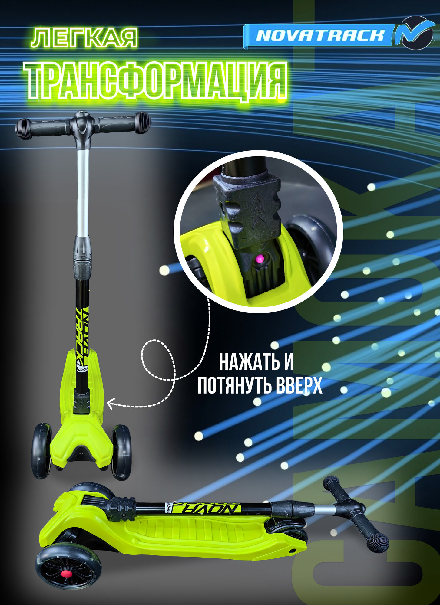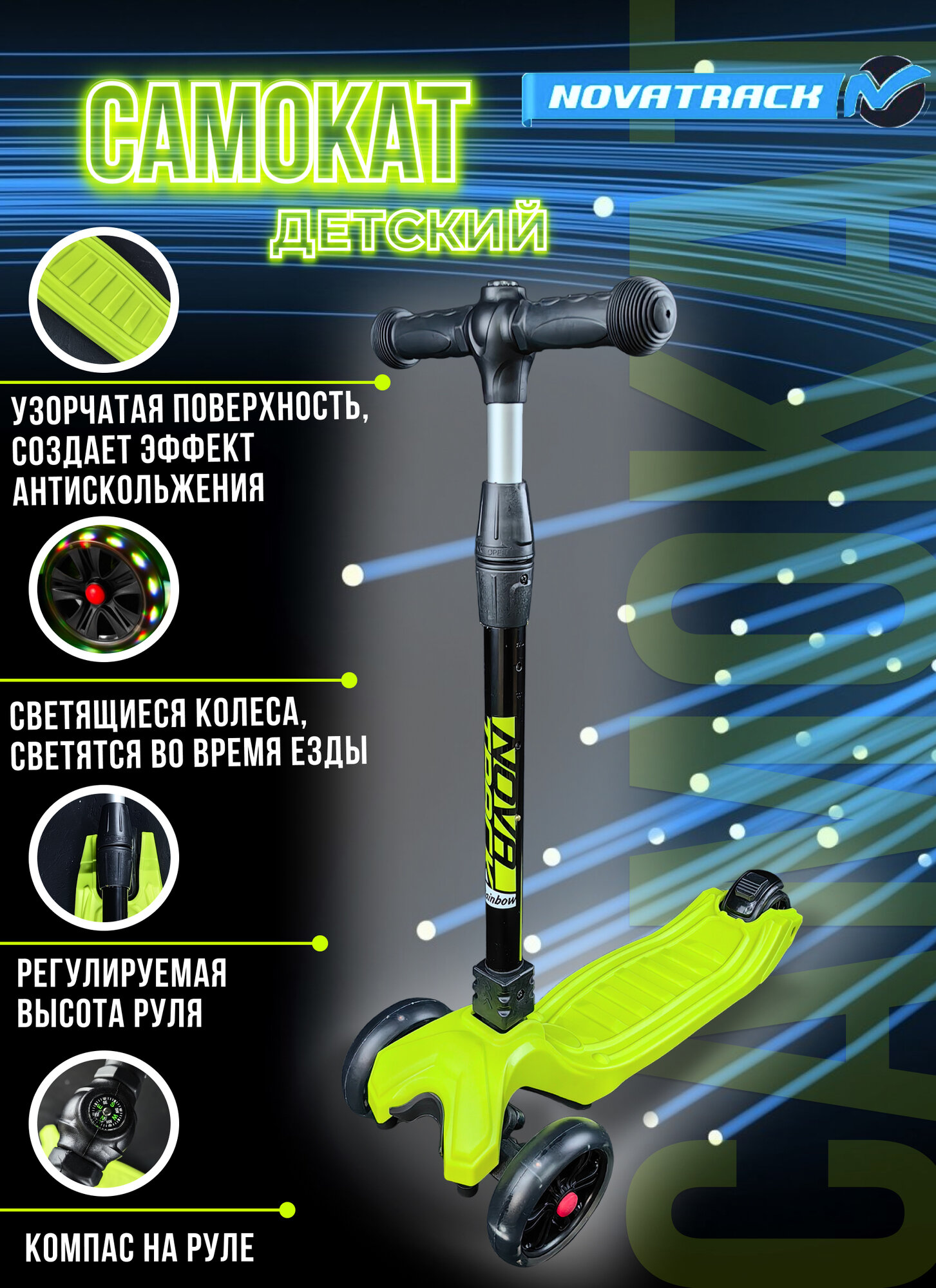 Самокат-кикборд Novatrack RainBow, для детей, складной, свет.широкие колеса PU пер.135*35 задн.90*24мм, ватер стикер, аксессуар-компас на руле, лимонный