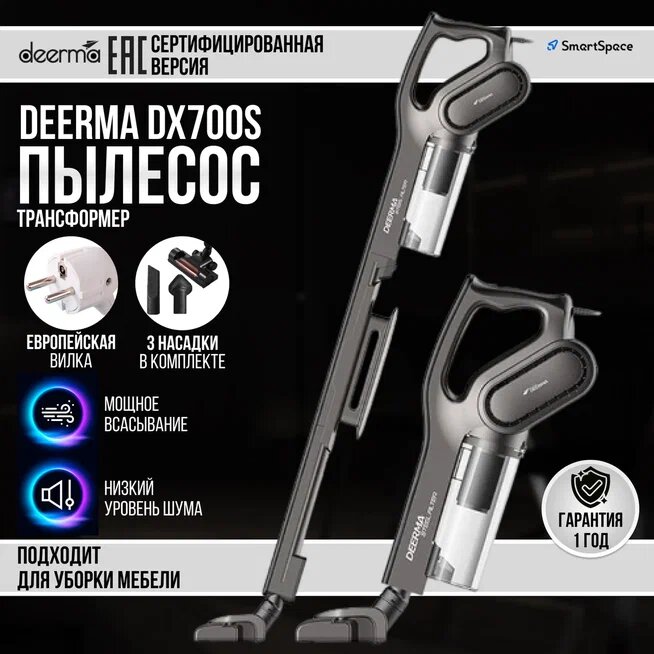 Пылесос Xiaomi Deerma DX700S проводной(4,5м), вертикальный, сухая уборка, 3 насадки, пылесборник 0,8л, чёрный