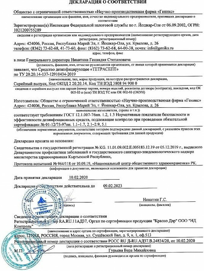 Профессиональное средство для дезинфекции Геникс Ника Тетрасепт 1 л, 1195380