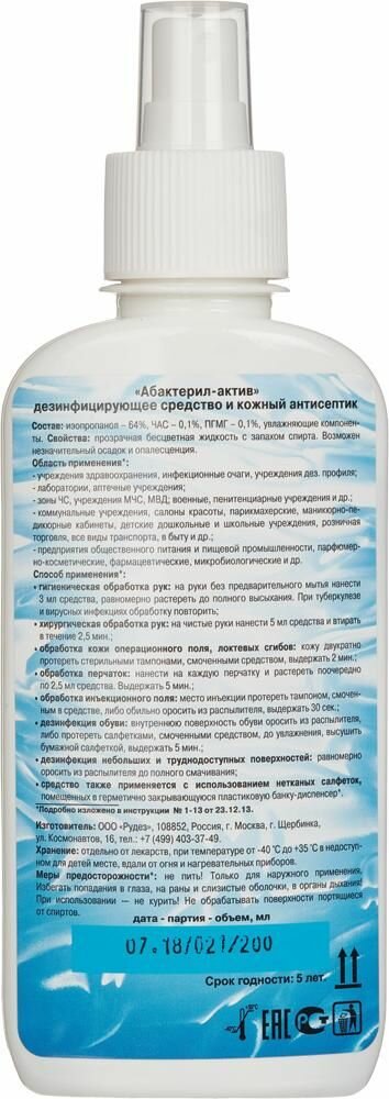 2 шт. Кожный антисептик с вирулицидной активностью ГОСТ 12.1.007-76 Абактерил-Актив 200 мл спрей