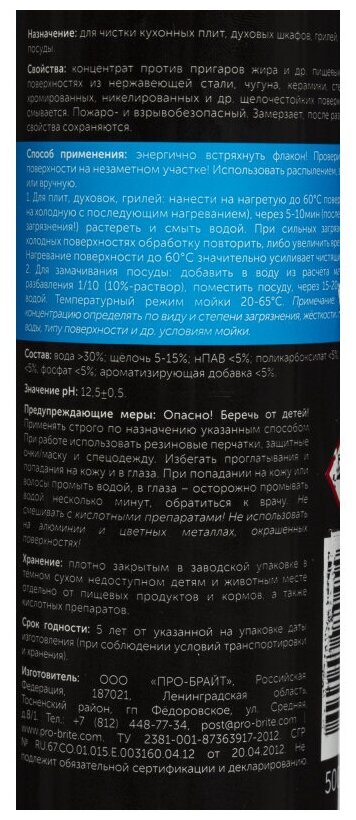 Pro-Brite GRILL Средство для чистки (для кухни) грилей и духовых шкафов, антижир 0,5л