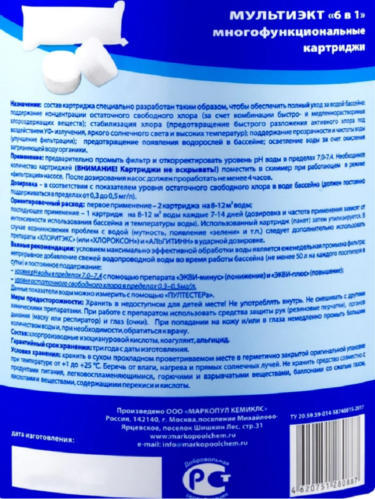 Химия для бассейна Маркопул Кэмиклс Мультиэкт 6в1 0,8кг (картриджи) 0041 .