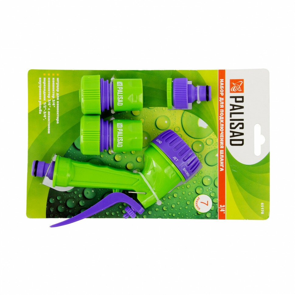 Набор для подключения шланга 3/4, пистолет 7 режимов полива, адаптер, 2 соединителя Palisad ( 65178 )