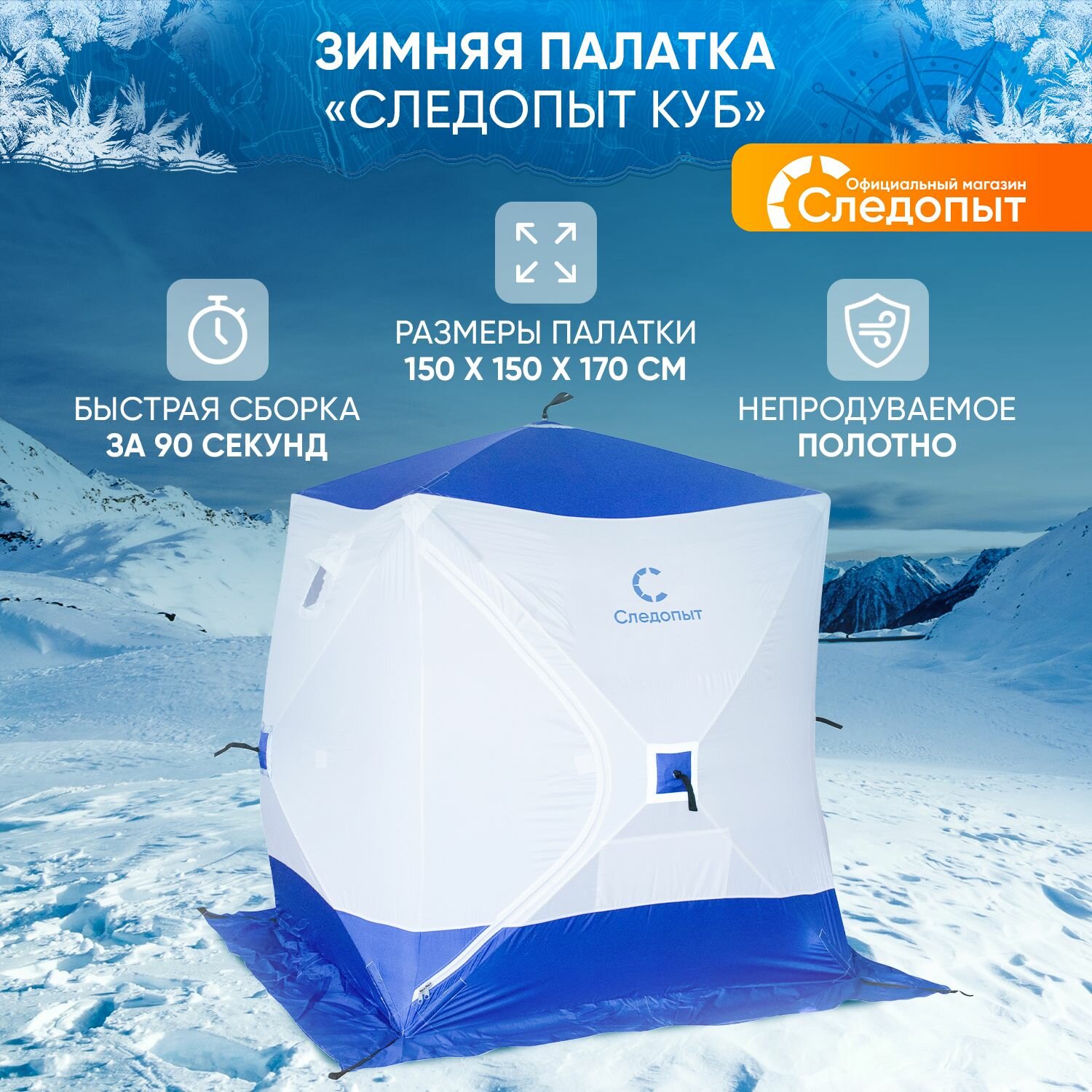 Палатка зимняя куб Следопыт 2-местная, 1,5х1,5х1,7, бело-синяя