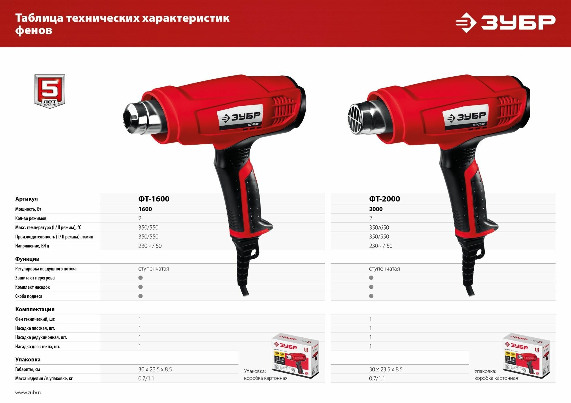 Фен технический (строительный), ЗУБР ФТ-2000, насадки 3 шт, 2 режима: 350град/ 350л/мин, 650град/ 550л/мин, коробка, 2000Вт