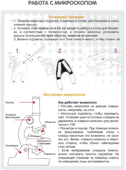 | Плюсы: | Дочка 8 лет обожает мамонтов и все, что с ними связано. Купили в подарок на день рождения этот набор. Изображение не очень хорошего качества, размывается, но увеличивает на всех 3 линзах. Нам пришлось долго ковыряться с фокусом, но для ребенка норм. Есть подсветка и дополнительные штуки в наборе для рассмотрения. Пока ничего не сломалось, хотя выглядит хрупковато. За свои деньги интересный вариант, и дочка увлечена. |