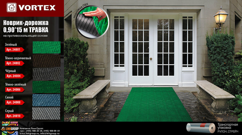 24001 Vortex Коврик-дорожка 0,90х15 м Травка на противоскользящей основе зеленый рул 24001 .