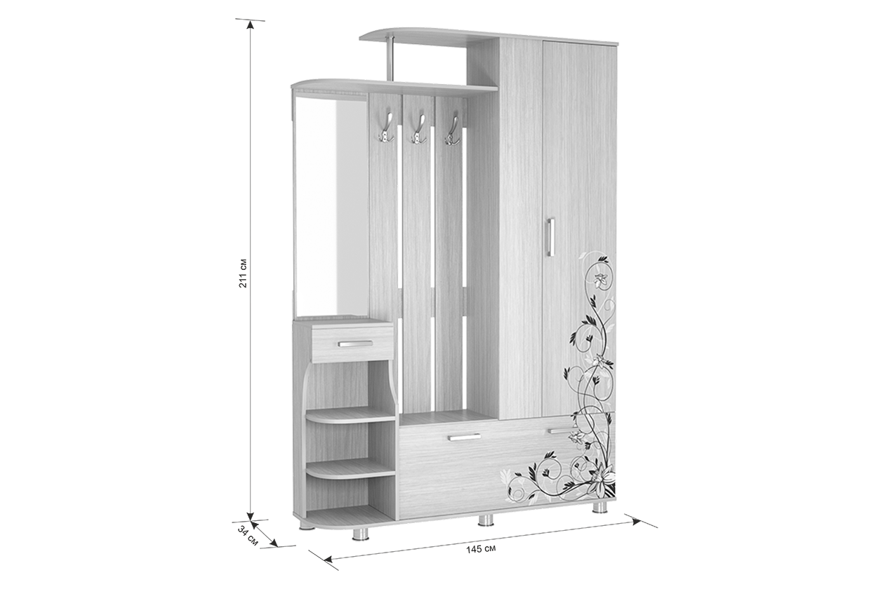 Узкая прихожая "Барселона-2" с зеркалом, 145*34*211 см., цвет Дуб сонома с рисунком, Mebelson