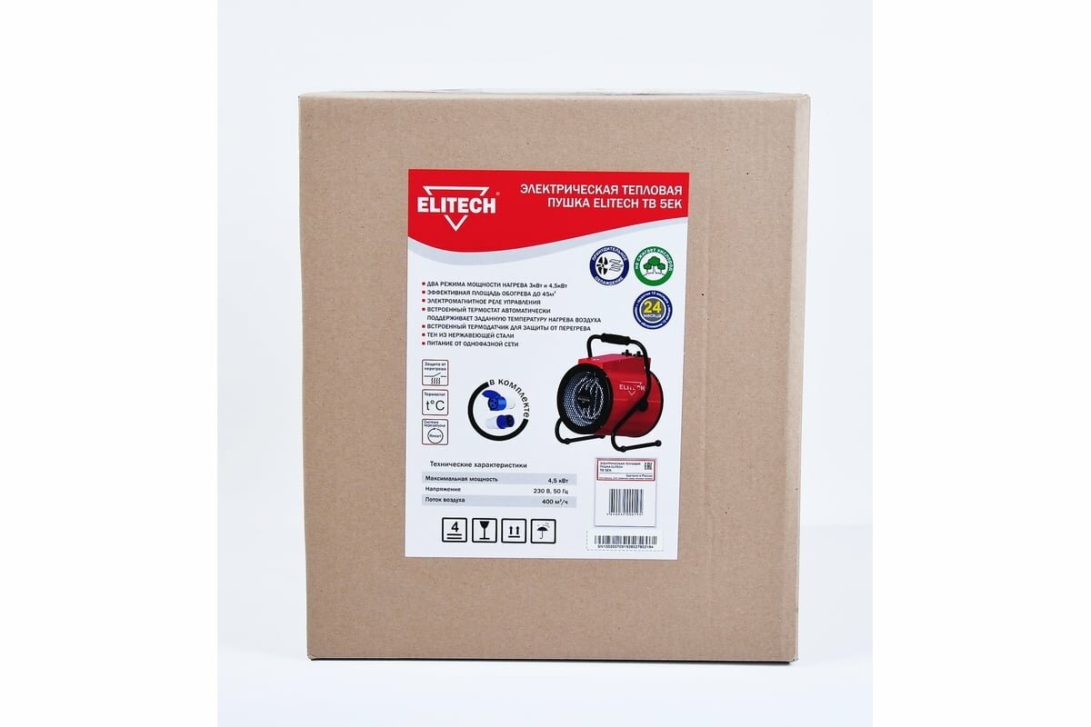 Тепловая электрическая пушка ELITECH ТВ 5ЕК 230В,3000-4500Вт,поток-400м3\ч,термостат,силовая вилка+розетка