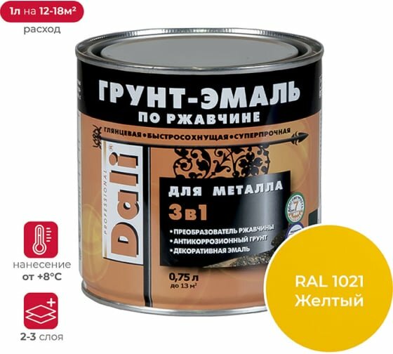 Dali / Дали Грунт-эмаль по ржавчине 3 в 1 гладкая алкидная RAL 1021 желтый 0,75л