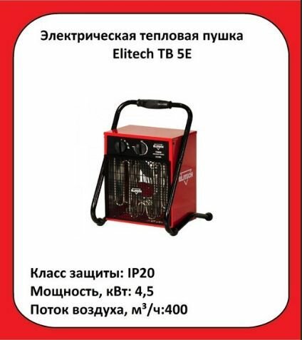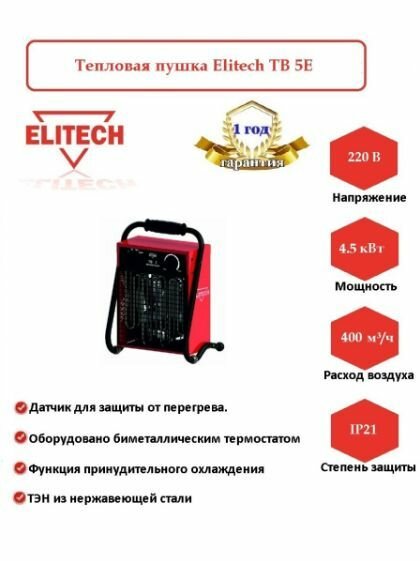 Ниже Вы можете прочитать отзывы на Тепловая пушка ELITECH ТВ 5Е, ознакомится с подробными характеристиками, посмотреть интересные обзоры и фотографии на Тепловая пушка ELITECH ТВ 5Е.