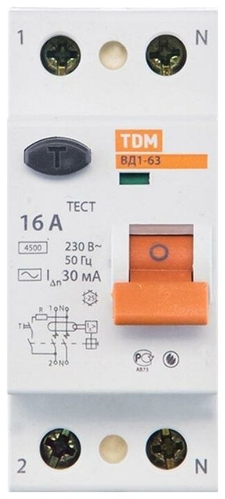 ТДМ Электрик ВД1-63 УЗО 2Р 16А хар-ка АС 30мА / TDM Electric ВД1-63 устройство защитного отключения 2 полюса 16А хар-ка АС 30мА