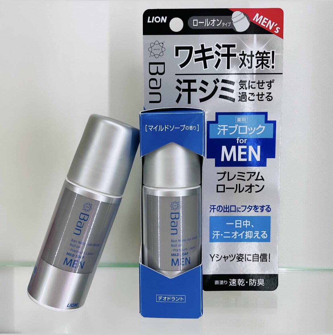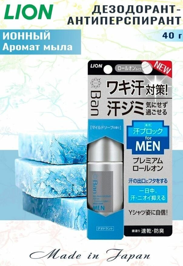 LION Дезодорант-антиперспирант Ban Premium Label мужской антибактериальный блокирующий потоотделение, аромат мыла, 40 мл. ролик