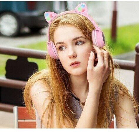Беспроводные наушники светящиеся Hoco W27 CAT ear, розовые, c tf card и блютуз 5.0 оригинальные