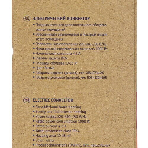 | Отзыв: | Живу в частном доме и для обогрева зимой пользуюсь печным отоплением, но по утрам прохладно использую дополнительно конвектор. Даёт хорошее тепло. Простой в управление, все переключатели сбоку. Легко убрать можно, лёгкий и есть шасси. Не перегревается. |