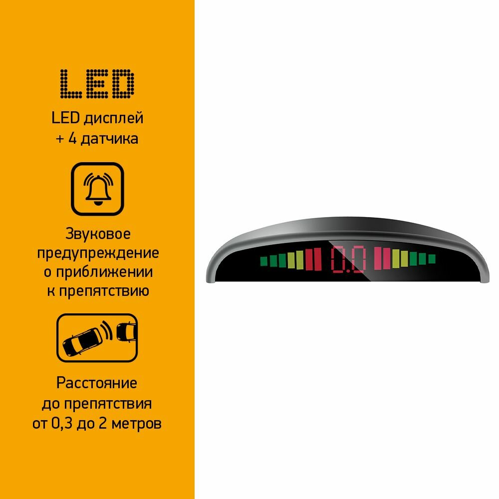 | Отзыв: | Покупаю уже второй такой радар, теперь уже на новую машину. Первый отработал без нареканий больше двух лет. Удобен в использовании, есть и визуальное и звуковое предупреждение о приближении к объекту. |