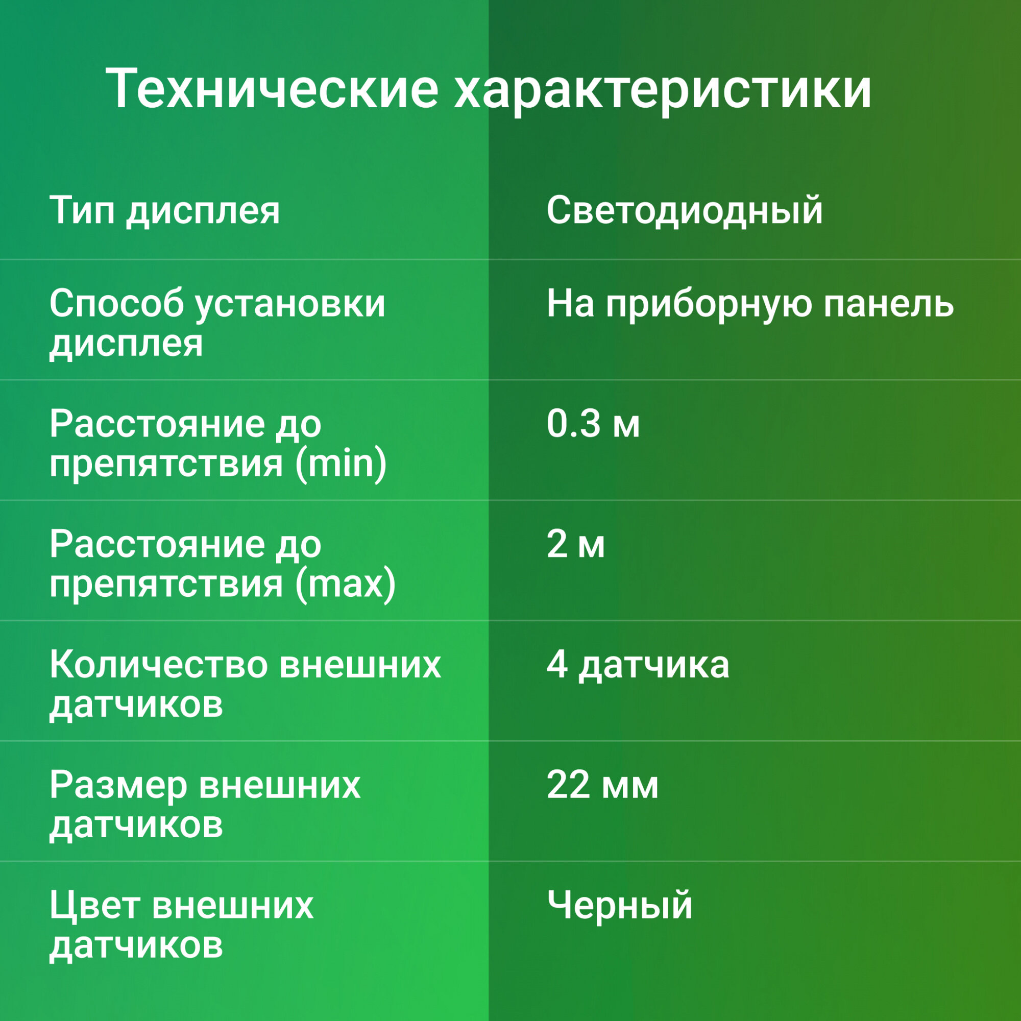 | Плюсы: | Cрабатывание за 2 метра до препятствия, информативный дисплей, 4 датчика, с установкой разберется любой |
