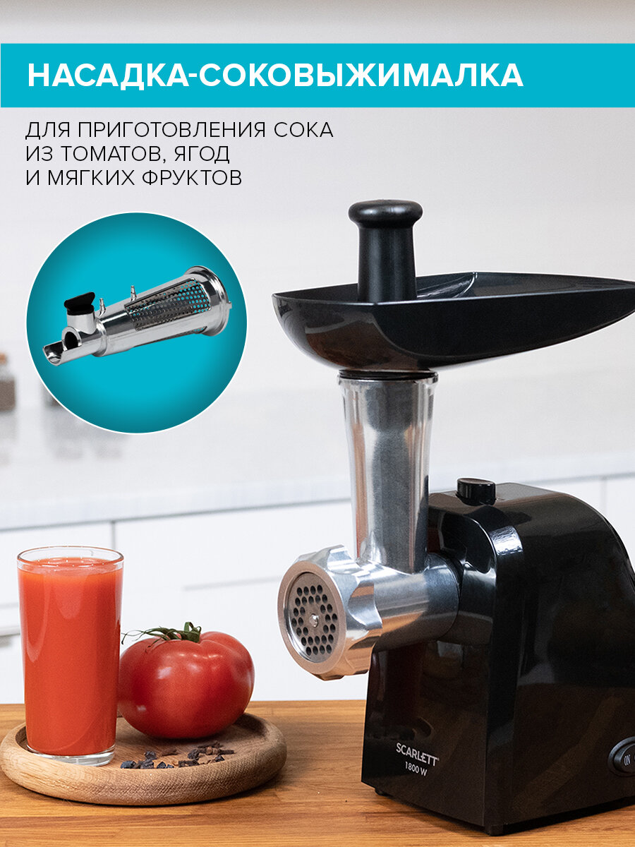Агрегат два в одном, кроме фарша,сосисок делаем каждое утро настоящий фреш, комбинируем овощи и фрукты, получается мега-полезная вкусная пища. Все режущие элементы из нержавейки, реакции с соком нет. Когда мясо не отборное и туго идёт, используем реверс, мощности в любом случае хватает даже а самых тяжёлых случаях.