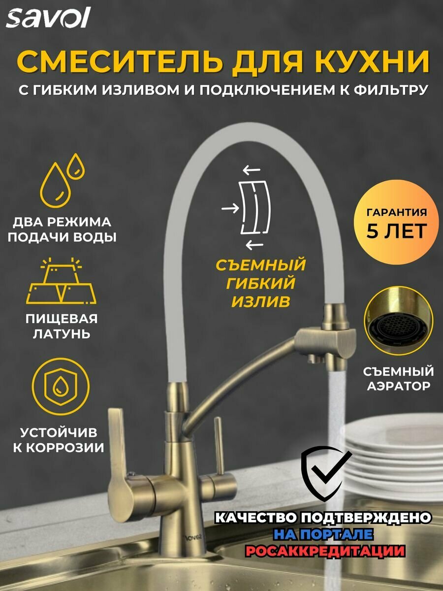 Смеситель Savol S-L1805B-04 для кухни, с подключением к фильтру, цвет золото / серый