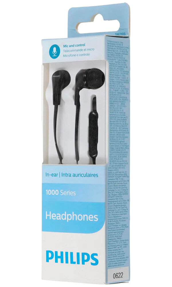 Наушники вкладыши с микрофоном Philips TAE1105BK/00 , мобильная гарнитура, чёрные